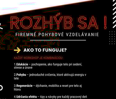 ROZHÝB SA! je firemný program pohybového vzdelávania a aktivácie, ktorý pomáha tímom cítiť sa lepšie, pracovať efektívnejšie a zvládať stres bez vyhorenia.