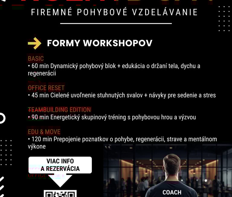Edu & Move 90–120 min Prepojenie pohybu, regenerácie a stres manažmentu.
